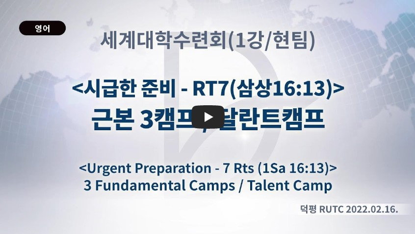 2023년 2월 9일 (목) 분류 2022- 세계대학 수련회 제목 현팀: “달란트 캠프- Heavenly Talent” 성경 일시/장소 2022년 2월 17일, 덕평RUTC(온라인) 설교 류광수 목사 (녹취정리: 차동호 목사) 출처 (사) 세계