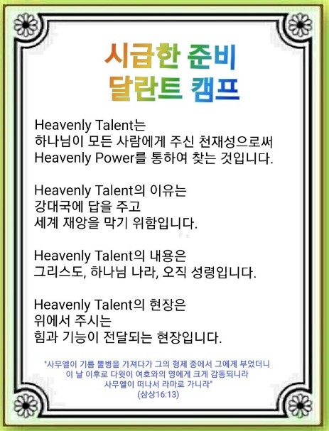 달란트 캠프의 내용은 세 절기입니다. 그리스도로 흑암에서 해방되어야 됩니다.(유월절) 또 광야 길에는 위에서 내리는 능력이 필요합니다.(오순절) 그리고 우리가 언약을 잡는 순간 영적 배경인 주의 천사들이 활동하게 됩니다.(수장절) 이것이 초대교회에서 완성되었는데, 바로 갈보리산, 감람산, 마가 다락방입니다. 우리도 이 축복을 누리면 하나님의 시간표에 똑같이 성취됩니다.