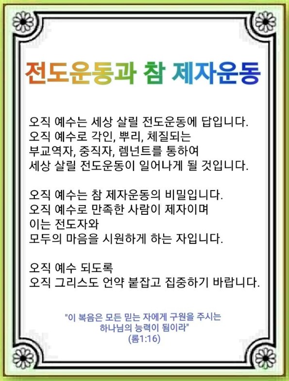 오직 예수는 세상 살릴 전도운동에 답이 됩니다. 그리고 참 제자운동은 오직 예수로만 이루어집니다.