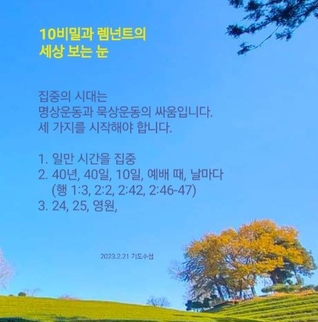 지금 우리는 집중의 시대를 만났습니다. 이 시대는 명상운동과 묵상운동의 싸움입니다. 이 싸움을 위해서 렘넌트는 세 가지를 시작해야 합니다. 첫째는 일만 시간을 집중하는 것입니다. 두 번째는 ‘40년, 40일, 10일, 예배 때, 날마다 집에서’ 집중한 것입니다.(행 1:3, 2:2, 2:42, 2:46-47) 마지막은 24, 25, 영원입니다. 이것은 성경에 나오는 시공간을 초월하는 응답입니다. 이것을 모르면 기도를 모르는 것입니다. 우리가 알아야 할 것이 있습니다.