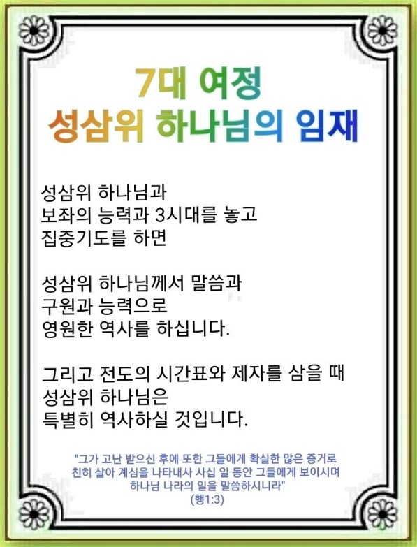 하나님이 특별하게 역사하시는 시간표가 있습니다. 제자 삼을 때(마 28:16-20), 예수 이름으로 기도하고 명령할 때(행 1:1), 하나님의 나라가 설명될 때(행 1:3), 오직 성령을 깨닫고 기도할 때(행 1:8) 특별히 역사하십니다. 무엇보다 7대 여정과 특히 그 안에 있는 성삼위 하나님과 보좌, 3시대를(3•9•3) 놓고 기도할 때 행 2장의 능력의 역사가 일어나게 됩니다.(행 2:1-4, 17-18, 41-47)
