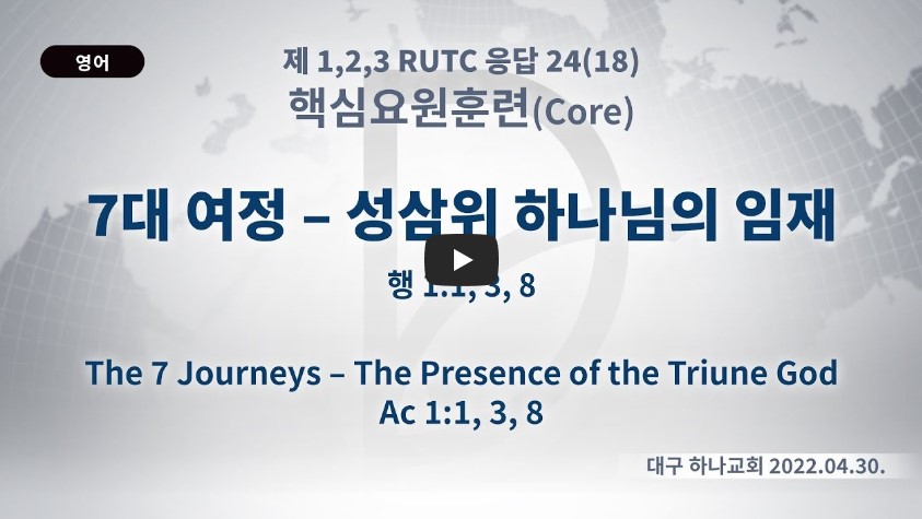 2023년 2월 22일 (수) 분류 핵심훈련(2022-제123RUTC응답24)- 18 제목 7대 여정- 성삼위 하나님의 임재 성경 사도행전 1:1, 3, 8 일시/장소 2022년 4월 30일, 대구 하나교회 설교 류광수 목사 (녹취정리: 차동