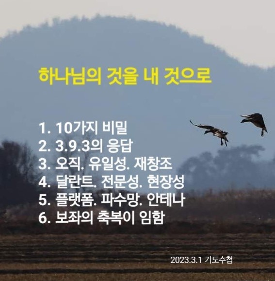 성경과 교회사, 역사에서 세계를 움직인 사람들은 전부 경쟁 시대를 넘어선 청년이었습니다. 바벨론 시대의 다니엘도 그랬습니다. 이렇게 되려면 하나님의 것을 내 것으로 만들어야 합니다. 누구도 막을 수 없는 0순위의 준비가 되어야 합니다. 그래서 첫째, 10가지 비밀로 시작해야 합니다. 둘째, 이때부터 내 수준이 아니라 3•9•3의 응답이 임하게 됩니다. 셋째, 그러면 나오는 것이 있습니다. 오직을 발견하고, 유일성을 보고, 재창조를 누리게 됩니다. 그리고 평생의 달란트와 전문성, 현장성이 나옵니다. 이것이 나의 플랫폼, 파수망, 안테나가 되는 것입니다. 이때 나와 현장에 보좌의 축복이 임하게 됩니다.