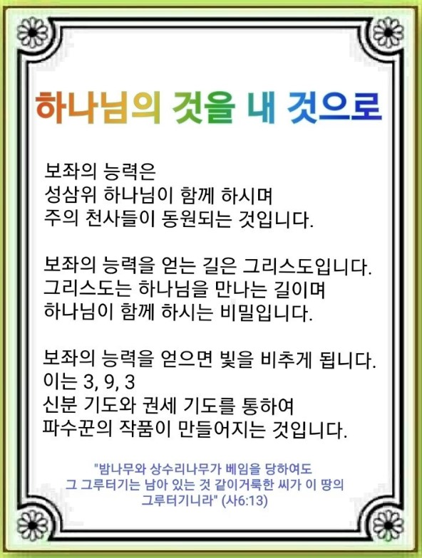 우리는 3•9•3 신분 기도, 그것을 전달하는 권세 기도를 해야 합니다. 그러면 파수꾼의 작품이 만들어집니다. 그것이 9흐름을 보는 플랫폼, 시스템이 되는 파수망, 24 소통되는 안테나입니다.