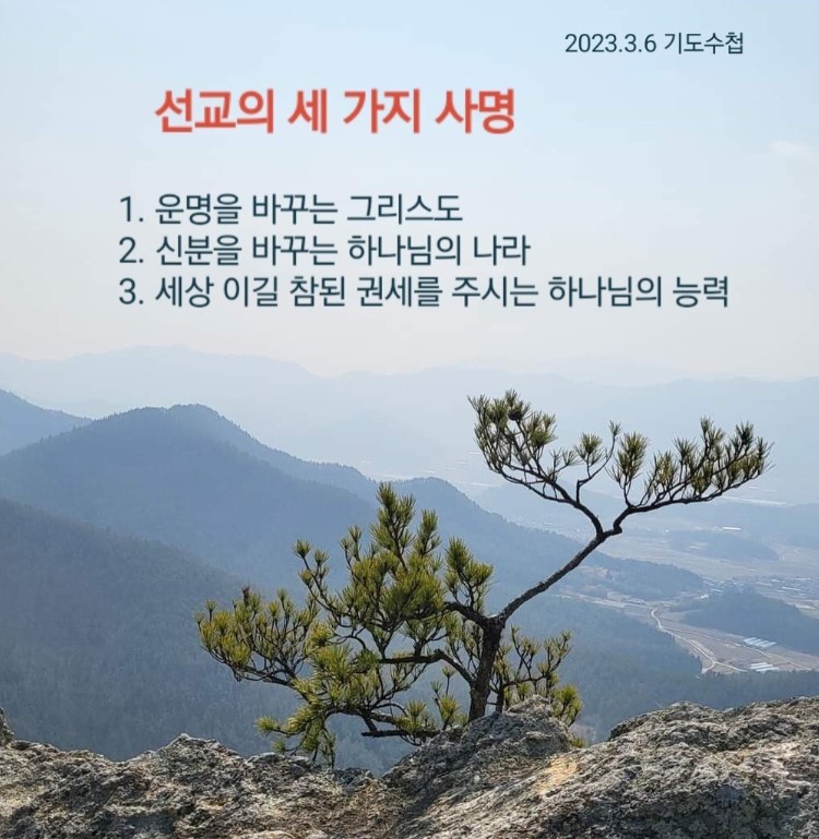 2023년 3월 6일 (월) 분류 주일예배 설교- 주일2부 제목 선교의 세가지 사명 성경 사도행전 1:1-8 일시/장소 2022년 5월 8일, 임마누엘교회(서울) 설교 류광수 목사 (녹취정리: 차동호 목사) 출처 (사)