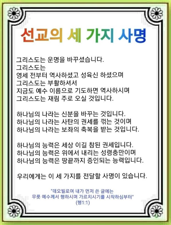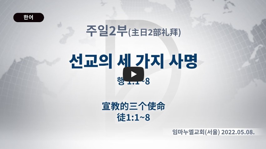 2023년 3월 6일 (월) 분류 주일예배 설교- 주일2부 제목 선교의 세가지 사명 성경 사도행전 1:1-8 일시/장소 2022년 5월 8일, 임마누엘교회(서울) 설교 류광수 목사 (녹취정리: 차동호 목사) 출처 (사)