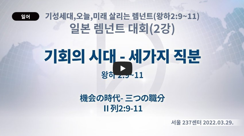 2023년 3월 9일 (목) 분류 2022- 일본 렘넌트대회 제목 2강: 기회의 시대- 세 가지 직분 성경 열왕기하 2:9-11 일시/장소 2022년 3월 29일, 언약교회(온라인) 설교 류광수 목사 (녹취정리: 차동호 목사) 출