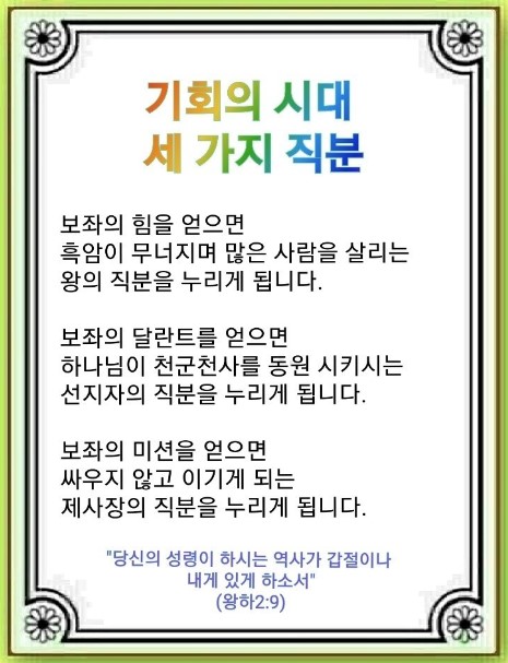 지금은 영적 문제 시대지만 우리에게는 기회의 시대입니다. 모든 재앙, 가정과 교회 문제, 어려움이 렘넌트에게는 모두 기회였습니다. 이때 하나님은 렘넌트에게 세 가지 직분을 주셨습니다. 이 직분 안에는 보좌의 축복을 누리는 갑절의 영감이 들어 있습니다. 이 축복은 네피림 시대를 살릴 비밀입니다.엘리사가 갑절의 영감을 받은 이유가 있습니다. 아무도 모르는 것을 보았기 때문입니다. 이것은 아무도 가지 않기 때문에 경쟁자가 없습니다.(Nobody) 엘리사는 오바댜가 100명의 선지자를 숨긴 것과 갈멜산 전투에 다리 역할을 했다는 것을 알았습니다. 호렙산으로 도망 간 엘리야에게 하나님이 어떤 메시지를 주셨는지도 알았습니다. 그래서 지명수배자인 엘리야를 따라가면 죽는 줄 알면서도 요단까지 쫓아갔습니다. 이것을 기회로 본 것입니다. 이때 엘리사는 아무도 누리지 못하는 세 가지 직분의 축복을 누렸습니다.