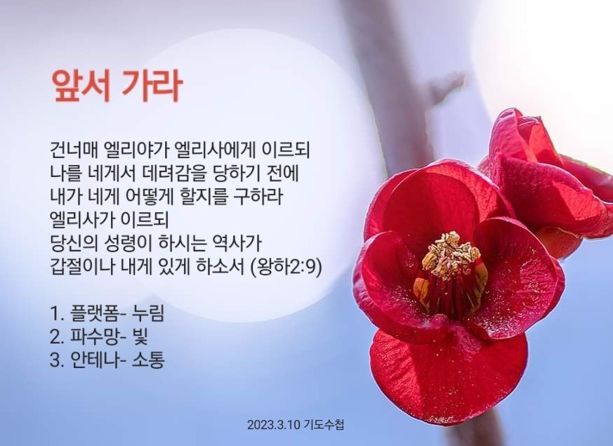 열왕기하 2:9-11 / 건너매 엘리야가 엘리사에게 이르되 나를 네게서 데려감을 당하기 전에 내가 네게 어떻게 할지를 구하라 엘리사가 이르되 당신의 성령이 하시는 역사가 갑절이나 내게 있게 하소서 (9)