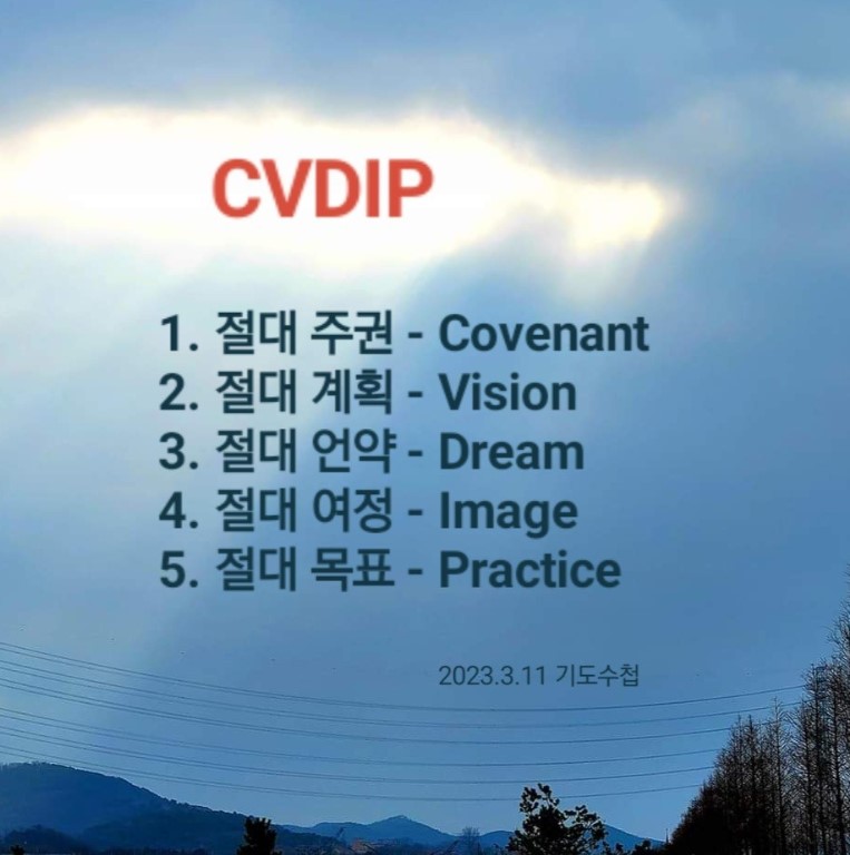 천천히 호흡하며 3•9•3을 누리는 기도부터 해야 합니다. 성삼위 하나님과 보좌의 축복, 3시대를 변화시키는 축복을 받아들이면 됩니다. 이 기도로 나의 운명과 신분이 바뀐 걸 알게 됩니다. 이때 내 상태가 달라지며 권세가 사용됩니다. 사람 때문에 속으면 안 됩니다. 모든 사람에게는 하나님의 계획이 있기 때문입니다. 또 현장을 두려워하거나 우습게 보면 안 됩니다. 그리고 일에 시험 들면 안 됩니다. 나의 일은 하나님이 가장 필요로 하시는 것입니다. 이 기도 속에서 보이는 것이 CVDIP입니다. 문제는 누가 CVDIP를 주었냐는 것입니다. 모든 종교는 주인이 '나'인데, 사실은 '사탄'입니다. 우리의 주인은 성삼위 하나님입니다.(Trinity) 여기서 CVDIP가 나와야 됩니다.