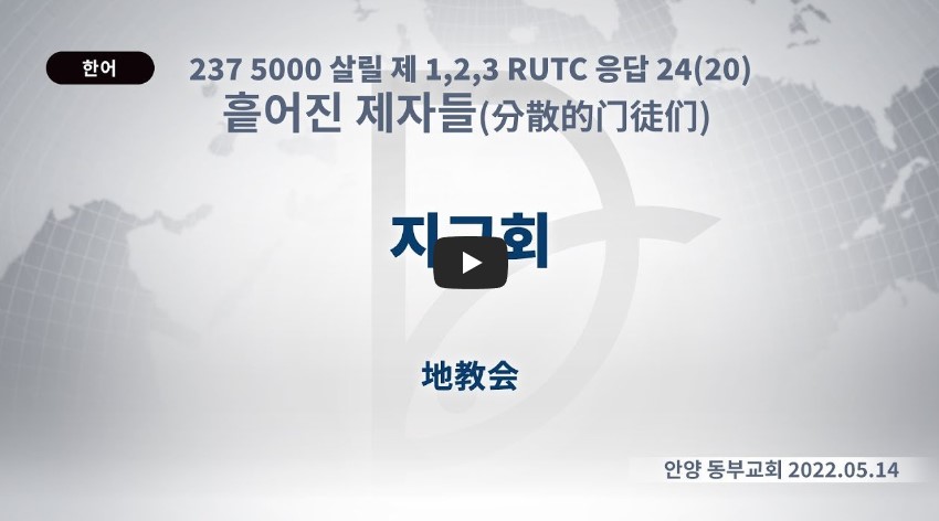 2023년 3월 15일 (수) 분류 흩어진 제자들(2022-제123RUTC응답24)-20 제목 지교회 성경 일시/장소 2022년 5월 14일, 안양 동부교회 설교 류광수 목사 (녹취정리: 차동호 목사) 출처 (사)세계복음화전도협회