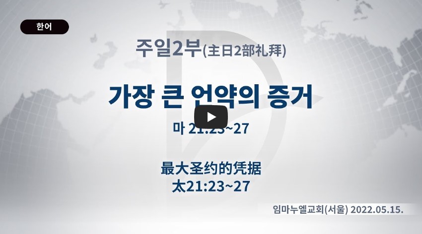 2023년 3월 18일 (토) 분류 주일예배 설교- 주일2부 제목 가장 큰 언약의 증거 성경 마태복음 21:23-27 일시/장소 2022년 5월 15일, 임마누엘교회(부산) 설교 류광수 목사 (녹취정리: 차동호 목사) 출처 (