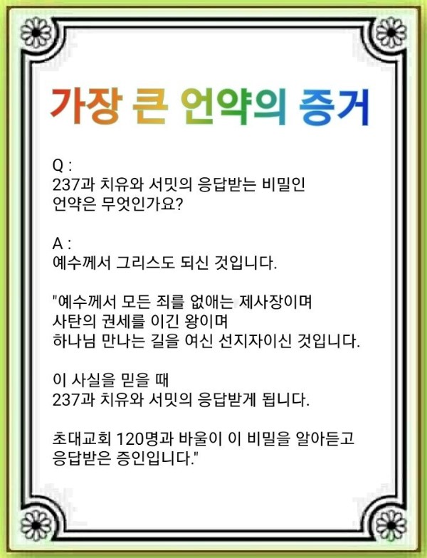 유대인들은 그들의 메시야 사상 때문에 예수께서 하나님의 아들인 것과 그 능력을 믿지 않았습니다. 그래서 예수께서는 마 13장에서처럼 진짜 가치 있는 것을 표시 나지 않게 하기 위해서 비유를 드셨습니다. 여기서 꼭 알아야 될 것이 있습니다. 왜 예수께서는 세례 요한을 가장 큰 인물이라고 하시고, 그에게 세례를 받으려고 하셨을까요? 세례 요한은 만인이 아는 제사장 지파이고, 세례를 주는 사람이었습니다. 그는 대속죄일에 양의 머리에 손을 얹고 사람의 죄를 사한 것처럼 예수의 머리에 손을 얹고 기도했습니다. 그것은 예수께서 모든 죄를 없애는 제사장, 사탄의 권세를 이긴 왕, 하나님 만나는 길을 연 선지자이심을 알고 모든 백성의 죄를 예수의 머리에 옮긴 것입니다.(마 3:15) 이후에 예수께서는 십자가에서 죽으시고 3일 만에 부활하실 것을(고전 15:20) 말씀하셨습니다. 이 언약을 붙잡고 237•치유•서밋에 도전하는 것입니다.
