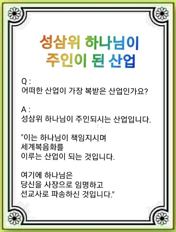 하나님이 아브라함에게 "내가 네게 지시할 땅으로 가라.”라고 하셨습니다. 이때부터 성삼위 하나님이 주인이 되어 보좌의 축복이 임한 산업이 시작된 것입니다. 우리는 이 축복으로 70군데 현장에 영향을 주고, 살려야 됩니다.이것을 알아듣지 못하니까 렘넌트를 노예, 포로로 흩으신 것입니다. 이것을 알아들은 사람이 70인입니다. 하나님은 애굽에서 나올 때 70장로를 세우셨고, 예수께서는 마지막 때 70제자를 세우셨습니다. 이것을 알아들은 아브라함은 단을 쌓았고(창 13:18), 렘넌트 7명에게는 보좌의 축복이 임했습니다. 또한 데살로니가교회는 그 믿음과 복음의 색깔로 인해 역사가 일어났습니다.(살전 1:3) 그렇다면 성삼위 하나님이 주인 된 산업은 무엇일까요?