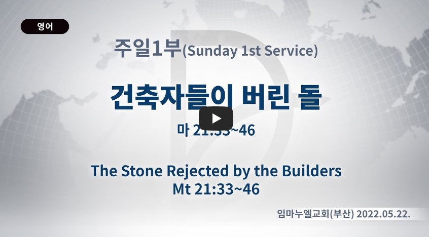 2023년 3월 28일 (화) 분류 주일예배 설교- 주일1부 제목 건축자들이 버린 돌 성경 마태복음 21:33-46 일시/장소 2022년 5월 22일, 임마누엘교회(부산) 설교 류광수 목사 (녹취정리: 차동호 목사) 출처 (
