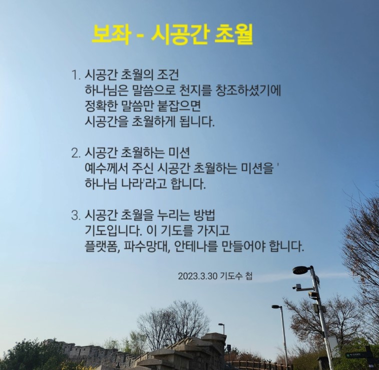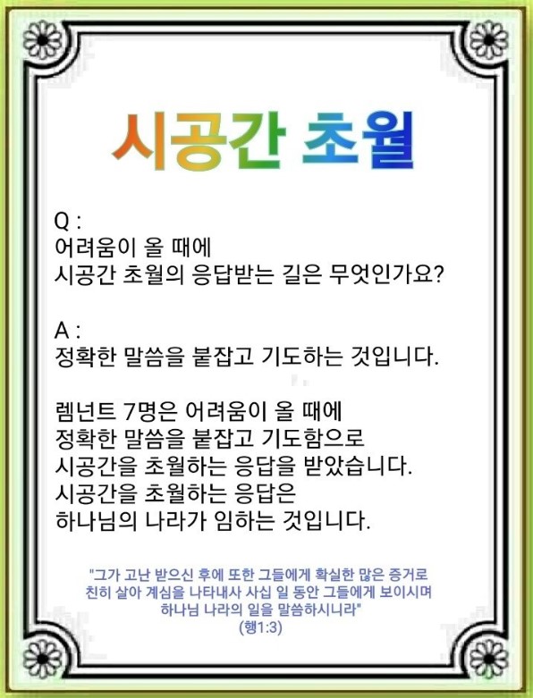 하나님은 말씀으로 천지를 창조하셨습니다. 그래서 정확한 말씀만 붙잡으면 시공간을 초월하게 됩니다.(창 1:1-13) 창 1:27, 2:7, 2:18의 시스템이 만들어지면 말씀이 우리와 우리 영혼 속에 임하시고 현장과 가정에 역사하십니다. 이때 지금도 공중권세를 잡고 있는 사탄의 시공간 초월을 막는 일이 일어납니다.(겔 28:10-14, 엡 2:2, 6:12)