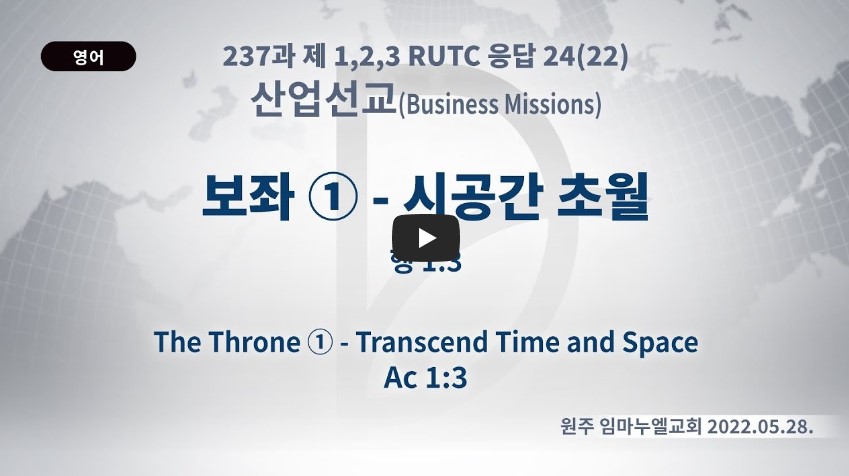 2023년 3월 30일 (목) 분류 산업선교(2022-제123RUTC응답24)- 22 제목 보좌①- 시공간 초월 성경 사도행전 1:3 일시/장소 2022년 5월 28일, 원주 임마누엘교회 설교 류광수 목사 (녹취정리: 차동호 목사) 출