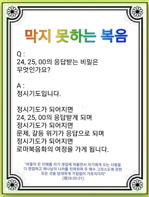 예배와 기도, 말씀을 붙잡는 시간에 하나님 나라의 일이 일어나서 내 속에 플랫폼과 파수망, 안테나로 세워집니다. 드디어 성삼위 하나님의 역사와 보좌의 축복, 3시대를 살리는 문들이 내게 임하기 시작합니다. 이때 성령이 임하고, 사탄은 결박되며, 하나님이 주의 천사들을 보내십니다. 이 기도를 누리는 사람은 문제를 만나면 답을 찾고, 갈등이 오면 갱신이 되며, 위기는 기회가 됩니다. 정시 기도가 되어지면 24가 되어 서밋이 됩니다. 하나님 나라의 일로 정복하는 25 응답과 함께, 절대 빼앗기지 않는 영원한 응답이 옵니다.