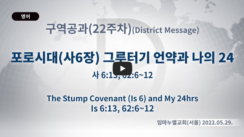 2023년 4월 4일 (화) 분류 구역공과- 2022년 22과 제목 포로시대(사6장) 그루터기 언약과 나의 24 성경 이사야 6:13 → 이사야 62:6-12 일시/장소 2022년 5월 29일, 임마누엘교회(서울) 설교 류광수 목사 (녹