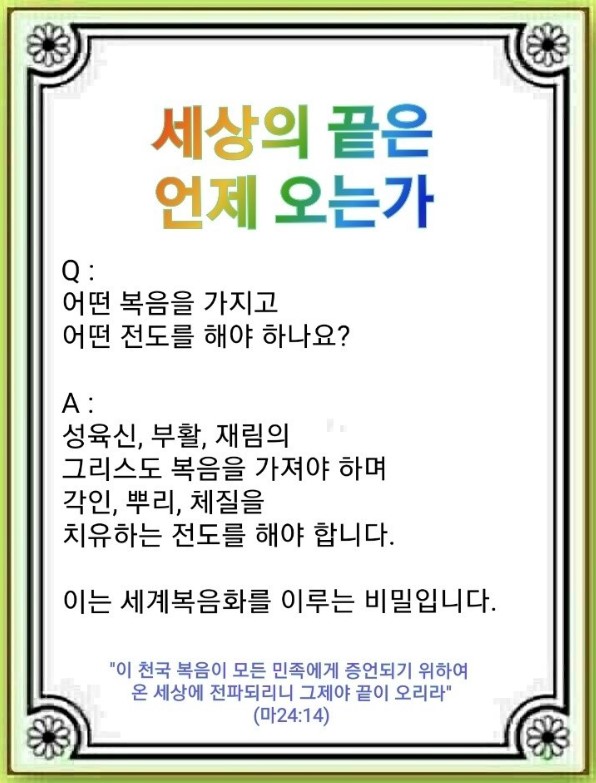 전 세계는 병들어 있습니다. 그들의 숨은 근본을 치유하는 전도를 해야 합니다. 그리고 많은 다민족은 문화에 대한 병이 있습니다. 이것을 고쳐주는 것입니다. 더 중요한 것은 이들이 다른 것으로 각인, 뿌리, 체질되어 있는 것입니다. 이것을 치유해 주어야 합니다. 이것이 전도입니다.