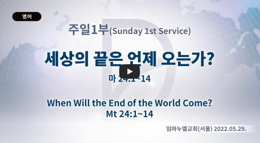 2023년 4월 5일 (수) 분류 주일예배 설교- 주일1부 제목 세상의 끝은 언제 오는가? 성경 마태복음 24:1-14 일시/장소 2022년 5월 29일, 임마누엘교회(서울) 설교 류광수 목사 (녹취정리: 차동호 목사) 출
