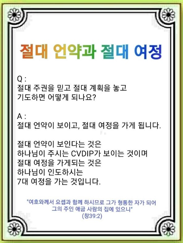 절대 언약이 보이면 하나님이 주시는 CVDIP가 보입니다. 그전에 먼저 보이는 것이 있습니다. 세상이 재앙으로 죽어가고 있고, 사람들은 혼란 속에 살고 있는 것이 보입니다. 그러다 어느 날 모든 것을 포기해 버리고, 영육의 질병에 사로잡힙니다. 이러다보니 분쟁 외에 할 것이 없습니다. 이때 하나님이 보게 하신 것이 있습니다. 이 재앙을 막는 ‘언약’입니다.(Covenant) 그러면 재앙 때문에 혼란에 빠진 사람을 살리는 길을 보게 됩니다. 다른 사람이 못 보는 ‘비전’입니다.(Vision) 포기 상태인 세상과 사람들을 보고 생기는 것이 ‘꿈’입니다.(Dream) 24가 되는 것이 꿈입니다. 이때 죽은 자를 살리는 하나님의 형상인 ‘이미지’가 나옵니다.(Image) 이것을 25라고 합니다. 드디어 영원한 작품이 만들어집니다.(Practice) 이때 답이 나옵니다. 그래서 모든 것이 CVDIP로 바뀌는 것입니다.
