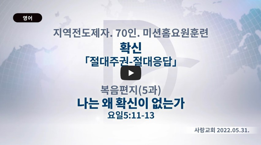 2023년 4월 8일 (토) 분류 2022- 237화요제자훈련(교재01-복음편지05) 제목 1-5강: 절대응답+절대계획+절대언약+절대여정+절대목표 성경 일시/장소 2022년 5월 31일, 사랑교회(온라인) 설교 류광수 목사 (
