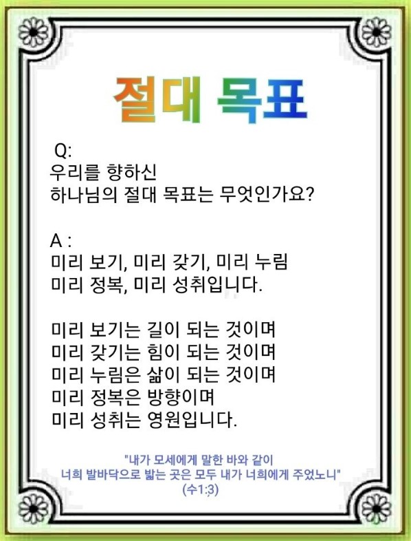 미리 정복하게 됩니다. 정복을 안 했는데 이미 정복해 버린 것입니다. 여호수아에게 “너희 발바닥으로 밟는 곳은 모두 내가 너희에게” ‘주겠다’가 아니라 “주었노니”라고 하셨습니다.(수 1:3) 이것을 ‘방향’이라고 합니다.