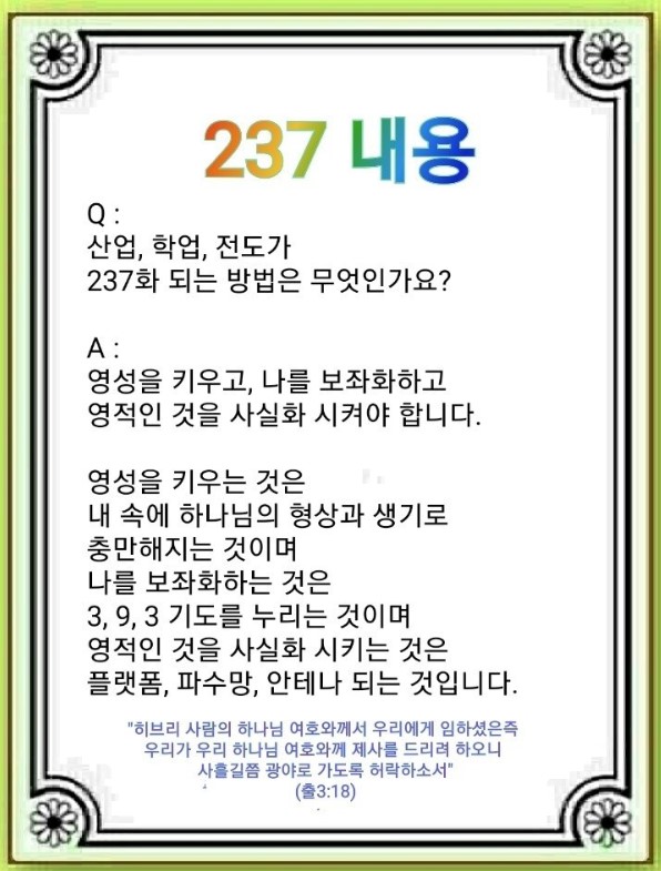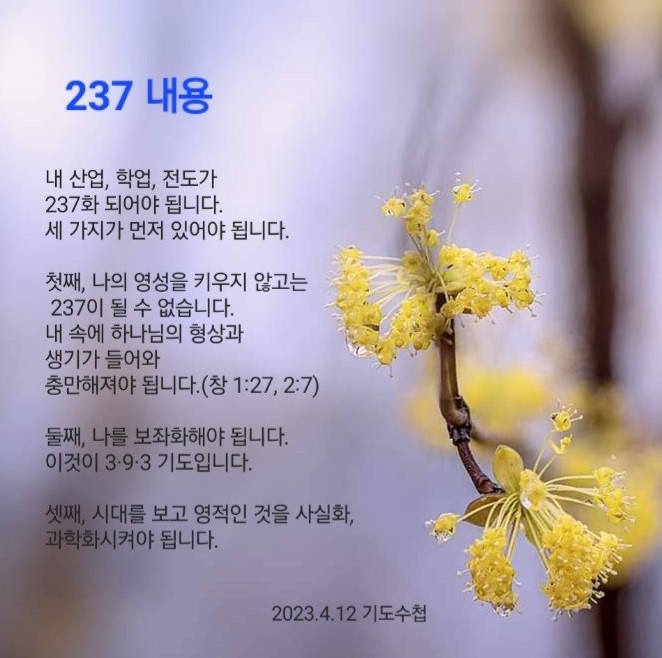 내 산업, 학업, 전도가 237화 되어야 됩니다. 이것을 위해서 세 가지가 먼저 있어야 됩니다. 첫째, 나의 영성을 키우지 않고는 237이 될 수 없습니다. 내 속에 하나님의 형상과 생기가 들어와 충만해져야 됩니다.(창 1:27, 2:7) 둘째, 나를 보좌화해야 됩니다. 이것이 3·9·3 기도입니다. 셋째, 시대를 보고 영적인 것을 사실화, 과학화시켜야 됩니다. 이것이 237을 움직이게 됩니다. 무엇보다 세계복음화는 성경에 있는 세 가지 내용이라야 됩니다.