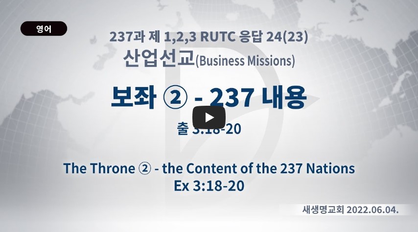 2023년 4월 12일 (수) 분류 산업선교(2022-제123RUTC응답24)- 23 제목 보좌②- 237 내용 성경 출애굽기 3:18-20 일시/장소 2022년 6월 4일, 새생명교회 설교 류광수 목사 (녹취정리: 차동호 목사) 출처 (사)세