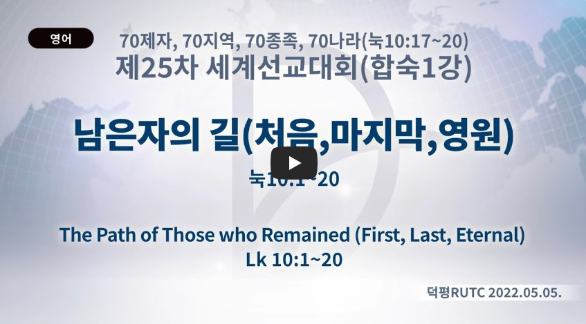 2023년 4월 13일 (목) 분류 2022- 제25차 세계선교대회 (선교사합숙) 제목 1강: 남은 자의 길→ 처음, 마지막, 영원 성경 누가복음 10:1-20 일시/장소 2022년 5월 5일-6일, 덕평RUTC 설교 류광수 목사 (녹취