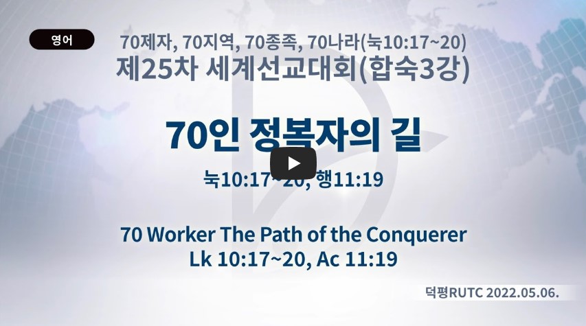 2023년 4월 15일 (토) 분류 2022- 제25차 세계선교대회 (선교사합숙) 제목 3강: 70인 정복자의 길 성경 누가복음 10:17-20, 사도행전 11:19 일시/장소 2022년 5월 5일-6일, 덕평RUTC 설교 류광수 목사 (녹취정