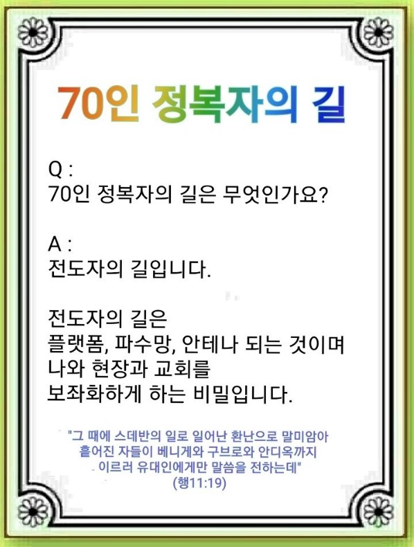 70인 정복자의 길을 걸어간 안디옥교회 중직자들은 사탄, 세상, 나와의 싸움을 넘어 전도자의 길을 갔습니다.(눅 10:17-20, 행 11:19) 우리가 평생에 받아야 될 축복은 ‘전도를 아는 70인’이 나에게 붙는 것입니다. 이것을 위해서 전도를 알아야 합니다. 첫째, 전도는 하나님이 완성하신 것을 영적으로 탈환하고 그리스도의 깃발을 꽂는 것입니다. 여기에 영적 사령관으로 파송되어 플랫폼을 만드는 것입니다. 둘째, 전도는 등대를 세워 빛을 발하여 재앙을 막는 70인 파수꾼이 되는 것입니다. 이것이 파수 망대입니다. 셋째, 전도는 종교인과 현장의 사람들이 모르고 있는 답을 주어서 영적으로 소통하는 70인이 되는 것입니다. 전도는 하나님의 절대 주권 중 1순위입니다. 절대 주권과 절대 계획 속에 있는 사람은 시험에 들거나 사람 소리에 좌우되지 않습니다. 절대 언약을 붙잡기 때문에 강단의 의미를 압니다. 절대 여정을 가기 때문에 현장의 가치를 압니다. 절대 목표를 알고 하나님의 은혜 속에서 나를 발견합니다. 이 70인이 해야 할 세 가지가 있습니다.