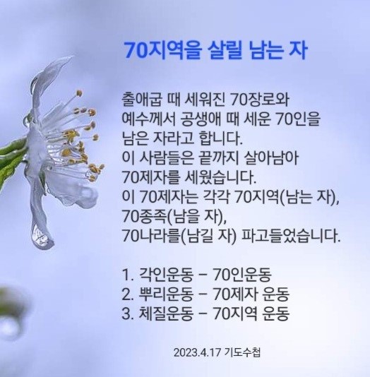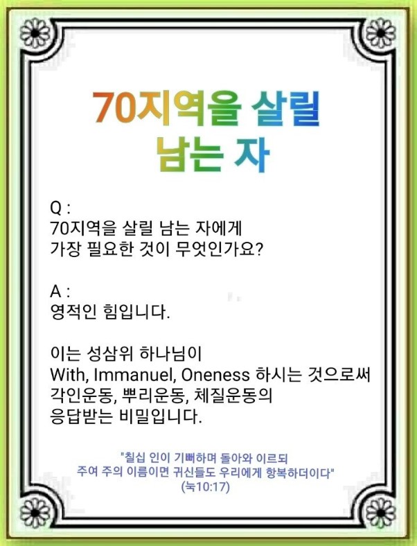 출애굽 때 세워진 70장로와 예수께서 공생애 때 세운 70인을 남은 자라고 합니다. 이 사람들은 끝까지 살아남아 70제자를 세웠습니다. 이 70제자는 각각 70지역(남는 자), 70종족(남을 자), 70나라를(남길 자) 파고들었습니다. 그중 70지역 살릴 남는 자에게 가장 필요한 것이 바로 ‘힘’입니다.(행 1:8) 이 힘을 가진 남는 자는 세상이 감당할 수 없는 사람이 됩니다.(히 11:38) 이 힘과 능력을 가진 초대교회 70인들은 Nobody와 Nothing속에서도 With, Immanuel, Oneness 축복을 누렸습니다. 보좌의 나라를 누리며 사탄 나라에 종노릇하는 세상 나라를 살렸습니다. 반면 바리새인들은 늘 ‘맞다, 안 맞다’, ‘된다, 안 된다’라고 하면서 시간을 다 보냈습니다. 문제가 생기면 분열하고, 위기가 오면 그제야 기도하는 수준이었습니다. 그 결과 7번 재앙을 입었습니다. 이때 이미 존재하고 있었던 3단체와 종교단체는 명상운동과 기운동, 초능력운동으로 전 세계를 장악했습니다. 70인 제자를 세우고, 이들에게 시급하게 해 주어야 할 것이 있습니다.