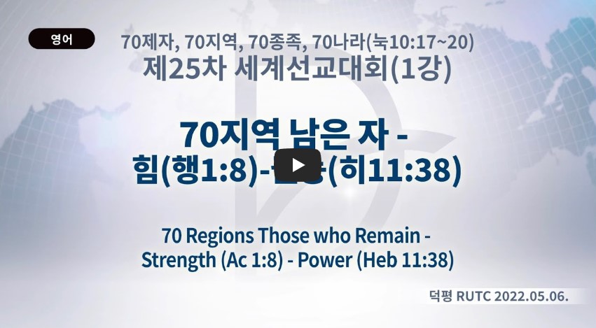 2023년 4월 17일 (월) 분류 2022- 제25차 세계선교대회 제목 1강: “70지역을 살릴 남는 자”→ 세상이 할 수 없는 능력→ 힘(권능) 성경 사도행전 1:8, 히브리서 11:38 일시/장소 2022년 5월 6일-7일, 덕평R