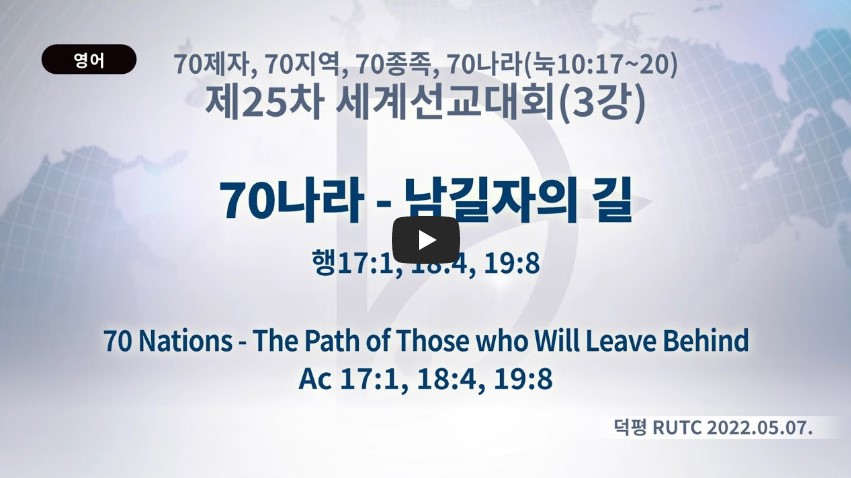 2023년 4월 19일 (수) 분류 2022- 제25차 세계선교대회 제목 3강: “70나라 살릴 남길 자의 길→ 후대” 성경 사도행전 17:1, 18:4, 19:8 일시/장소 2022년 5월 6일-7일, 덕평RUTC 설교 류광수 목사 (녹취정리: