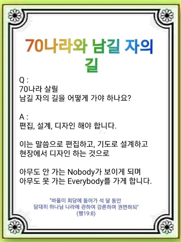 ‘남은 자’는 복음으로 완전히 끝이 나고, 끝을 아는 자입니다. 이 사람은 평생에 70제자를 세우게 됩니다. 남은 자는 반드시 ‘남는 자’가 됩니다. 하나님이 주시는 큰 힘을 가지게 되어 70지역을 살리는 것입니다. ‘남을 자’는 70종족의 흑암 문화를 선으로 바꿉니다. 우리는 70나라를 살릴 ‘남길 자의 길’을 가면 됩니다. 바울이 남은 자, 남는 자, 남을 자, 남길 자의 축복과 237 살리는 길이 ‘후대’에 있음을 보고 회당으로 갔습니다.(행 17:1, 18:4, 19:8) 그래서 우리는 하나님의 그 시간, 그 장소, 그 일 속에만 있으면 됩니다. 그렇다면 남길 자는 70인의 길을 어떻게 가야 할까요?
