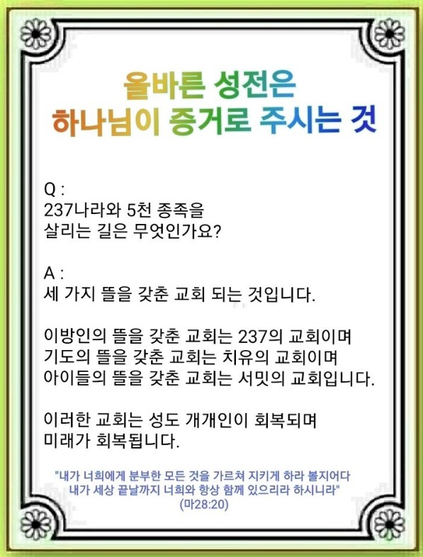 하나님이 제1, 2, 3 성전을 주신 이유와 없애신 이유가 있습니다. 그곳에는 237나라가 올 수 있고, 후대를 움직이며, 이들을 치유할 세 가지 뜰이 없었습니다. 우리는 와 있는 237이 내 교회라고 느낄 수 있는 공간을 만들어야 합니다.