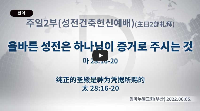 2023년 4월 26일 (수) 분류 주일예배 설교- 주일2부 제목 (성전건축헌신) 올바른 성전은 하나님이 증거로 주시는 것 성경 마태복음 28:16-20 일시/장소 2022년 6월 5일, 임마누엘교회(부산) 설교 류광수
