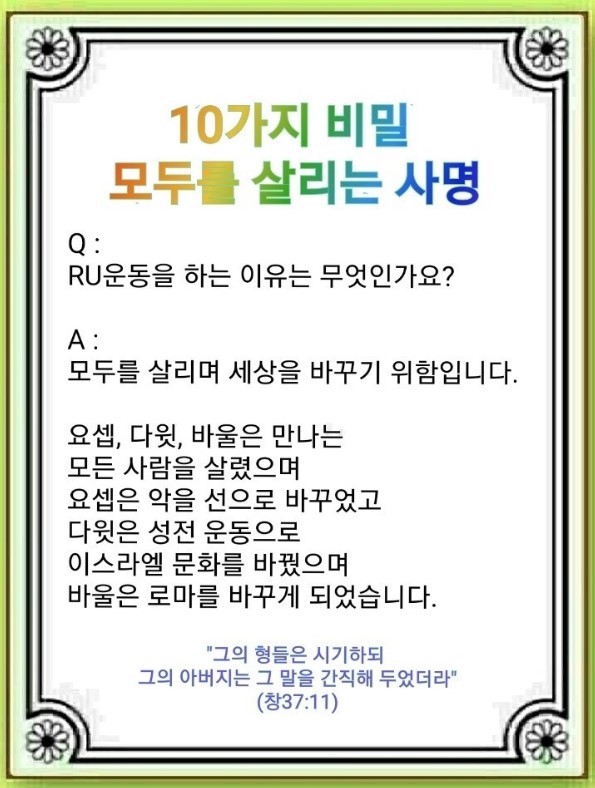 2023년 4월 29일 (토) 분류 핵심훈련(2022-제123RUTC응답24)- 24 제목 (RU핵심예배) 10가지 비밀- 모두를 살리는 사명 성경 창세기 37:1-11 일시/장소 2022년 6월 11일, 덕평RUTC 설교 류광수 목사 (녹취정리: 차