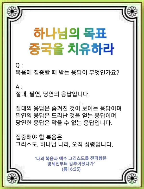 이때 숨겨진 것이 보이면서 ‘절대’라는 응답이 옵니다.(롬 16:25-27) 내가 받은 복음이 그 나라의 오랜 전통과(롬 16:25) 지금의 문제(롬 16:26) 그리고 미래에(롬 16:27) 증거가 되는 일이 벌어집니다.