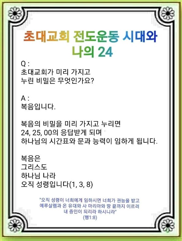 초대교회는 미리 시간표를 보았습니다. 마가 다락방에서 역사가 일어나면서 24시의 축복을 누리기 시작했습니다. 답을 가지고 있어야 24가 됩니다. 그리고 하나님의 응답으로 초월되는 25가 옵니다. 25는 보좌의 축복이기 때문에 우리의 시간표가 아닙니다. 이때 없어지지 않는 영원한 것으로 임하게 됩니다.