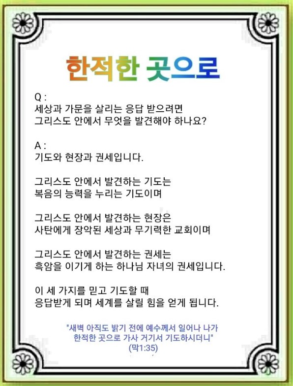 한적한 곳으로 가서 기도하시기 바랍니다. 요셉은 극한 외로움 속에서, 다윗은 쫓기면서도 기도했습니다. 어려움 당할 때 초대교회 중직자들은 원니스되어 기도했습니다. 이 속에서 마가 다락방교회, 안디옥교회, 롬16장의 인물이 탄생했습니다.