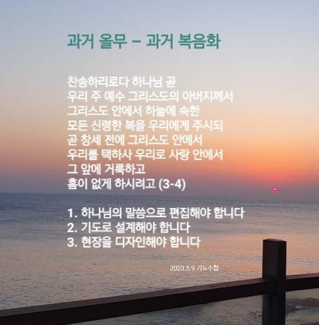 2023년 5월 9일 (화) 분류 2022- 237새가족/현장사역자 훈련 제목 1강: 과거 올무→ “과거 복음화” 성경 에베소서 1:1-13 일시/장소 2022년 6월 14일, 일산 영광교회(온라인) 설교 류광수 목사 (녹취정