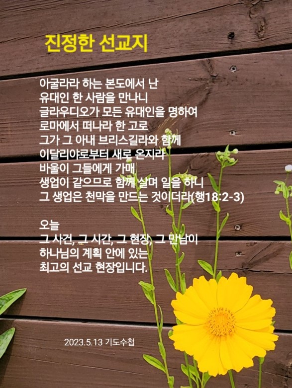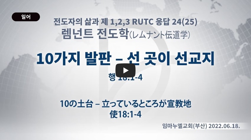 2023년 5월 13일 (토) 분류 렘넌트전도학(2022-제123RUTC응답24)- 25 제목 10가지 발판- 선 곳이 선교지 성경 사도행전 18:1-4 일시/장소 2022년 6월 18일, 임마누엘 교회(부산) 설교 류광수 목사 (녹취정리: