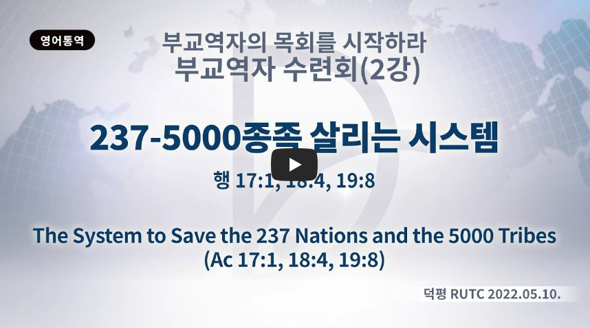 2023년 5월 16일 (화) 분류 2022- 부교역자 수련회 제목 2강: 237나라-5000 종족 살리는 시스템 성경 사도행전 17:1, 18:4, 19:8 일시/장소 2022년 5월 10일, 덕평RUTC 설교 류광수 목사 (녹취정리: 차동호 목사)