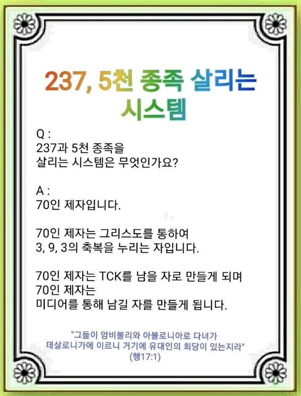 [언약 기도] 하나님 감사드립니다. 시공간 초월하는 성삼위 하나님의 역사와 보좌의 능력을 가지고 237, 5천 종족 살리는 시스템을 누리게 하옵소서. 남은 자, 남는 자, 남을 자, 남길 자의 길로 가 70제자 세우고, 70지역, 70종족, 70나라 살리게 하옵소서, 예수 그리스도 이름으로 기도하옵나이다. 아멘.