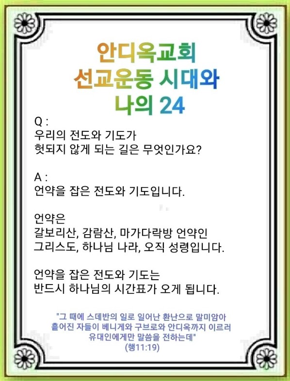우리가 언약을 잡고 하는 전도와 기도는 하나도 헛된 것이 없습니다. 어려움 속에 있는 사람들이 모여서 안디옥교회를 세웠습니다. 하나님은 이 시간표에 바울을 보내셨습니다. 이 안디옥교회가 처음으로 선교운동을 했습니다. 이 부분이 깨달아지면 24가 되어집니다. 환난과 어려움에는 이유가 있습니다. 하나님은 세계 선교 때문에 반드시 우리를 축복하십니다.(행 11:19-30) 어려움 당하는 이스라엘에게 하나님은 “네 생각과 내 생각은 다르다.”라고 하셨습니다.(사 55:8-9) 이 말씀을 알아들은 사람들이 결국 바벨론을 복음화했습니다. 언약 가진 사람에게는 환난이 기회요, 더 큰 문이요, 갱신의 기회요, 새로운 전환점입니다. 안디옥교회는 어떻게 이 응답을 받았을까요?