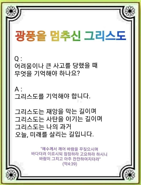 마가복음 4:35-41 / 예수께서 깨어 바람을 꾸짖으시며 바다더러 이르시되 잠잠하라 고요하라 하시니 바람이 그치고 아주 잔잔하여지더라 (39)