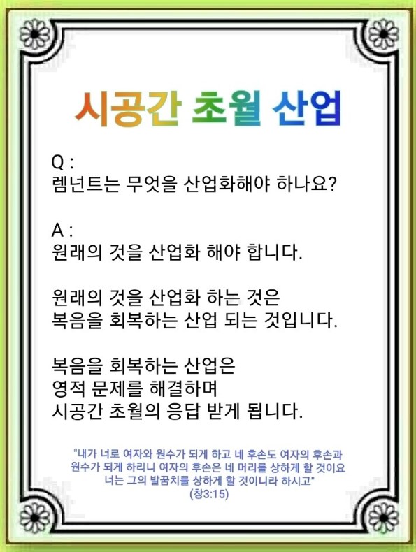 시공간 초월을 산업화시켜야 하기 때문에 렘넌트는 미디어 공부를 많이 해야 됩니다. 아브라함은 창 12:1-3의 언약을 깨닫고 단을 쌓았습니다.(창 13:14-18) 하나님이 이때부터 빛의 경제를 회복하게 하셨습니다.(창 14:14-20) 그리고 “내가 너의 상급이고 방패다.”라고 하셨습니다.(창 15:1-7) 수양의 언약이 각인된 이삭에게(창 22:1-21) 100배의 축복, 샘 근원, 르호봇의 축복을 주셨습니다.